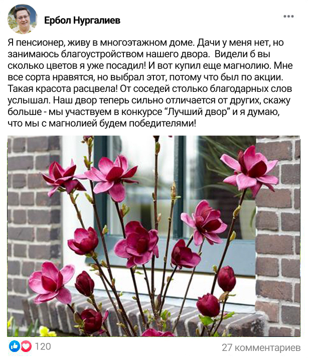 Когда мы впервые посетили выставку цветов в Нидерландах, я поняла, что в Казахстане должны быть лучшие саженцы для наших клиентов. В следующем году на выставке мы познакомились с представителями "HOOGENRAAD", которые к тому времени уже были одним из ведущих питомников в мире. Мы заключили с ними договор и стали первыми официальными представителями этого питомника в Казахстане.