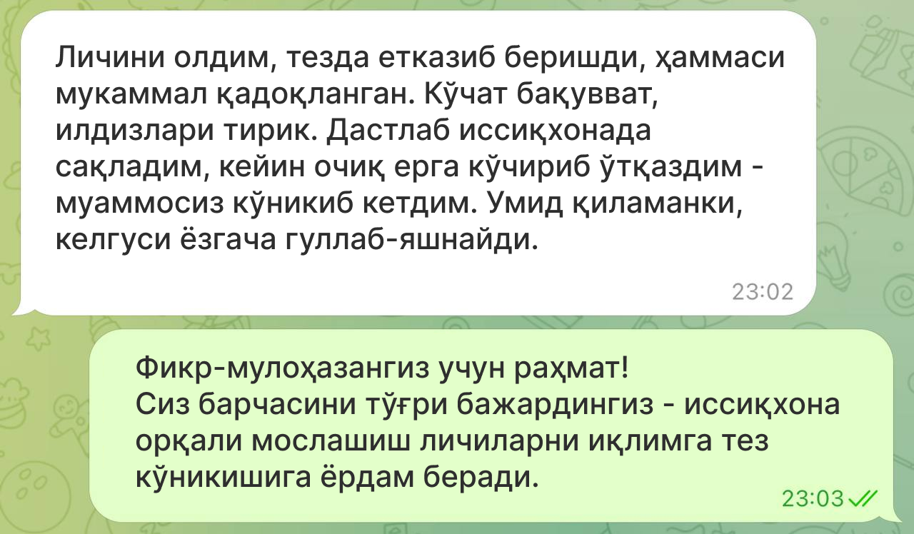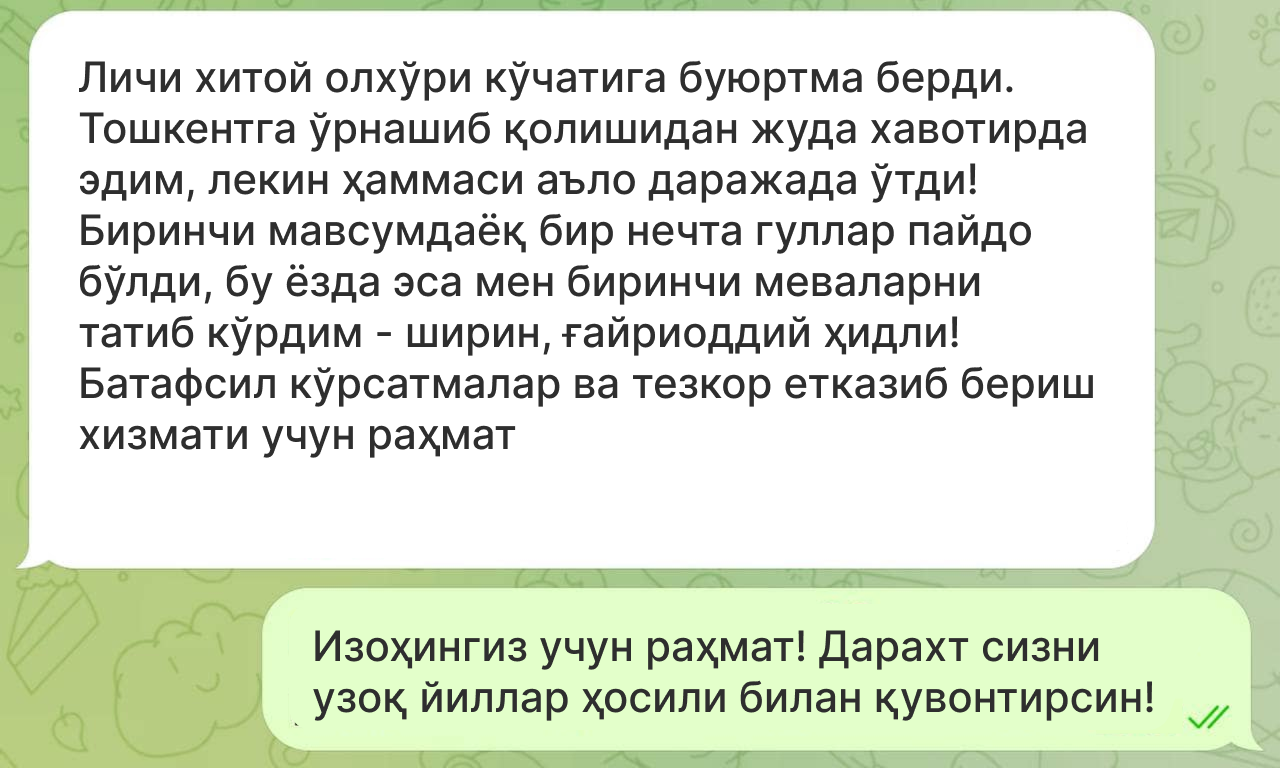 Мижозларимиз Хитойнинг Личи олхўриси экилиши ва илк ҳосили ҳақидаги таассуротлари билан ўртоқлашмоқда.