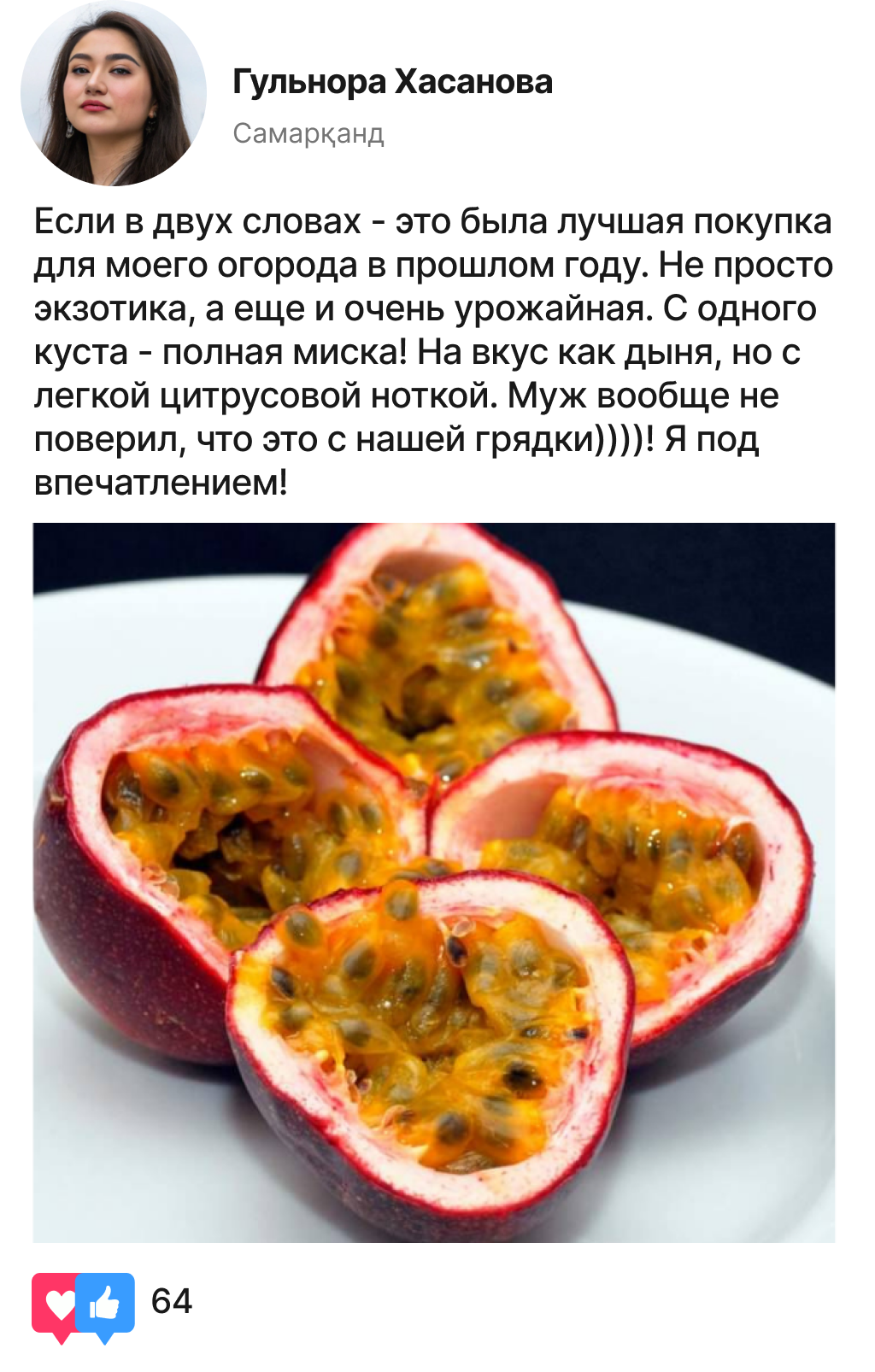 Passiora маракуйя — бу иссиқ экзотика бўлиб, энди уни Ўзбекистонда ҳам етиштириш мумкин. Унинг асосий афзаллиги — бизнинг шароитимизда барқарор ҳосил: бир тупдан 40 тагача хушбўй мева. Мевалари йирик, оғирлиги 170 дан 250 граммгача, ёрқин нордон-ширин таъмга эга, ширали эти сариқ-тўқ сариқ рангда.